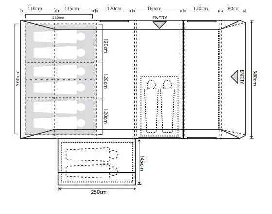 • 230cm deep, darkened Twilight micro-polyester 6 person bedrooms with a 2/2/2 zip-in divider</p